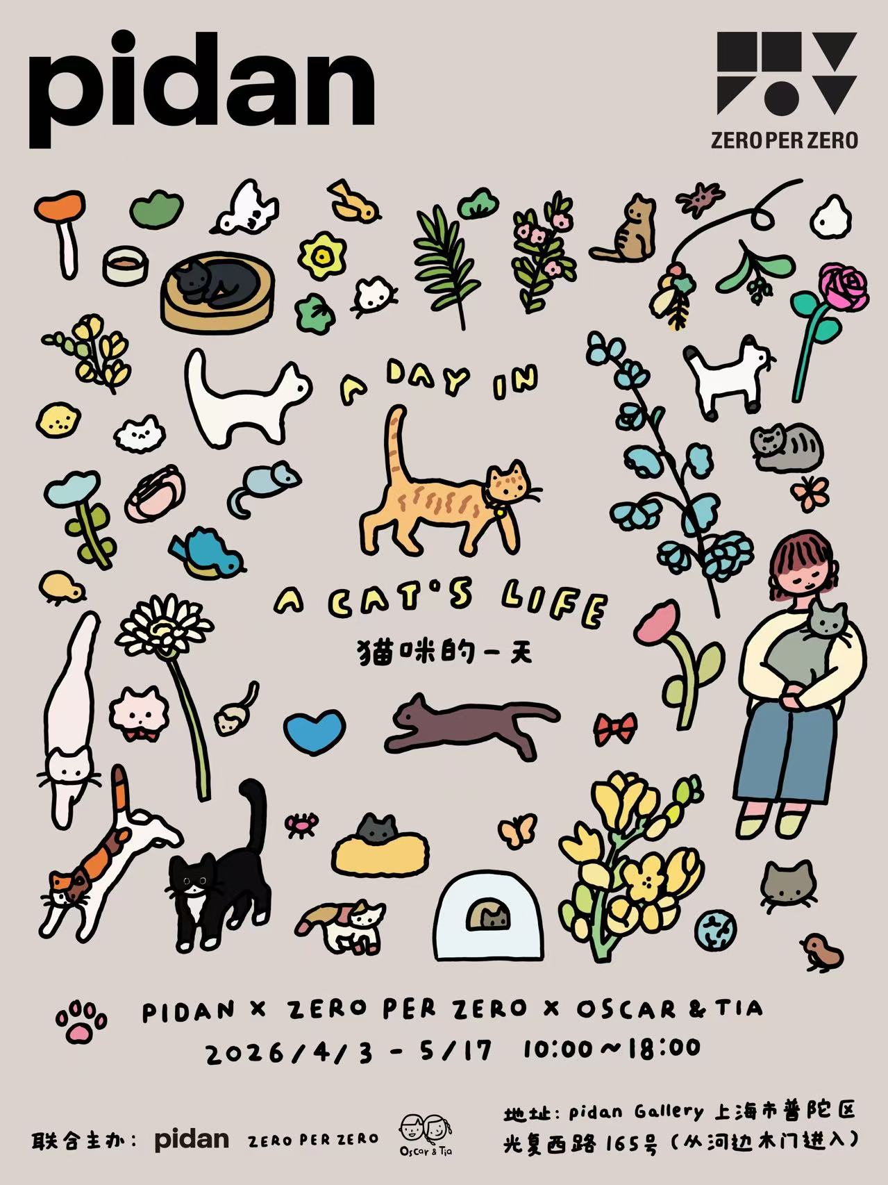 pidan Gallery将举办世界知名艺术工作室ZERO PER ZERO全球首展「猫咪的一天」。展览由「猫为先」的pidan联合ZERO PER ZERO及生活方式品牌Oscar&Tia主办,以简约而松弛的绘画风格和沉浸式置景,呈现家猫和流浪猫各自的日常瞬间。这是ZERO PER ZERO的猫咪绘画首次得到集中呈现,还有艺术家特别为本次展览新创作的「猫咪在上海」等系列作品。展览免费且猫咪友好,欢迎携猫看展!
