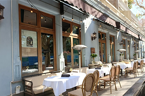 夏朵花园是一片丁香花园围墙内退让出的沿街场地,几乎就是一条狭长的走廊室内区域设计成凉廊的感觉,以弧形门廊做象征性区隔,加上凉廊的半开放效果以及土黄色的墙面颜色,颇有一些南欧街头咖啡馆和小餐厅的韵味。