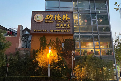 功德林在上海乃至全国有素食鼻祖之称,其素食制作技艺被列为国家级非物质类文化遗产,有素鸡、素鸭、功德金华、黄油蟹粉等素食菜肴三百多个品种。功德林南京西路店古色古香,室内装修风格稳重深沉、典雅端庄。餐厅共分两层,一层是快餐区,即食面条点心之类的主食;二层是点菜区。功德林不仅吸引周边居民和商务楼里的公司职员,大批国内外游客也都对功德林素食情有独钟。