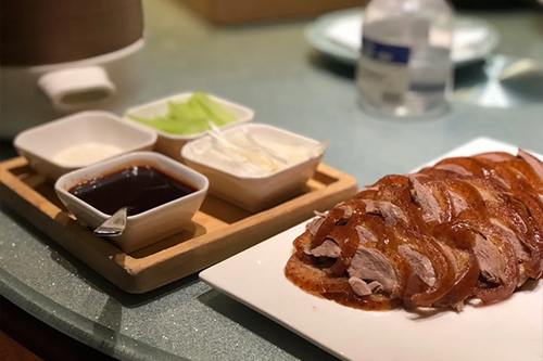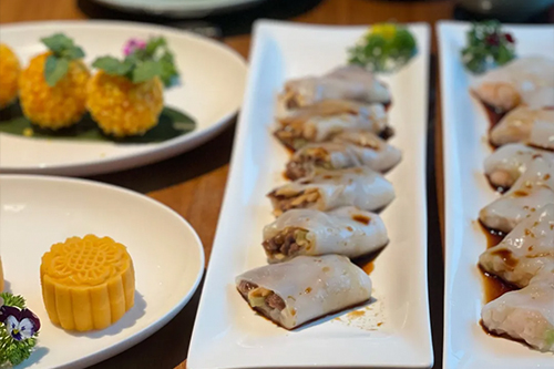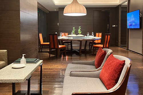 餐厅主场是一个方形的玻璃中央厨房,可以亲睹厨师们由烹调至摆盘上桌的每个细节。餐桌围绕厨房,高贵典雅的高背弧形卡座,桌面摆设中西合璧,温润如玉的青瓷餐具和茶具,搭配西式插花和红酒,用大理石和原木拼接设计的餐桌,细节精致又考究。落地窗外是挑高达9米的室内空中花园,窗外绿荫葱翠的别致园景增添了不少浪漫气氛。龙庭琇厨主打粤菜,砖砌烤炉将北京烤鸭引入菜单。