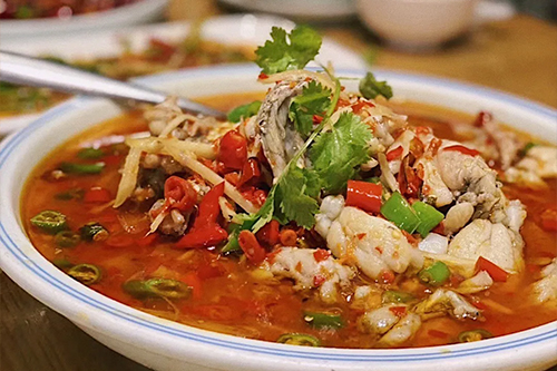 本来川菜小小的门面大概几十个座位,到了饭点时常大排长龙,靠着那一口让人欲罢不能的霸道川味。本来川菜主打自贡盐帮菜,味道麻辣厚重,遵从原味不改良。盐帮仔姜跳跳蛙小米辣和仔姜齐上,从舌尖辣到胃底,特别是嫩姜带来的鲜甜回味和暖意,搭配鲜嫩弹牙的牛蛙,吃到额头发汗也停不下筷。麻是招牌自贡大麻鱼的主调,一大盆上桌只见满满一层花椒,鱼肉裹着厚重的花椒香气鲜味更加突出,麻到不行。