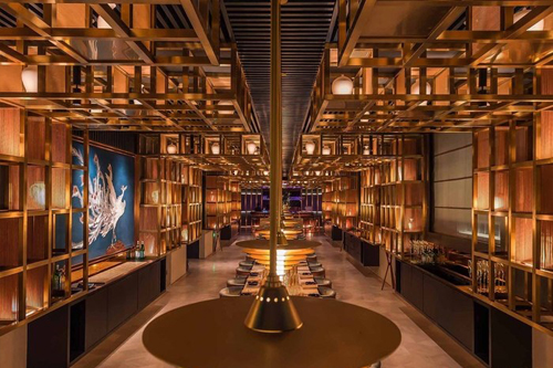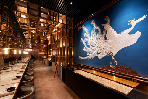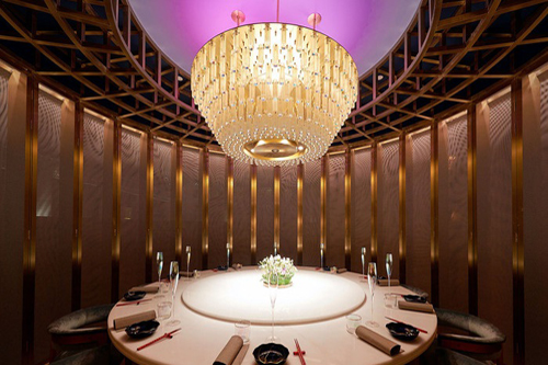 孔雀厅宛如孔雀博物馆,在射灯照耀下的水晶孔雀绽放着炫目的光彩。餐厅奢华的视觉风格以金色为主调,有价值19万人民币的巨幅孔雀刺绣,还有最长可同时容纳60人的餐桌。和普通接地气的川菜馆不同,这里将川菜西化,每一道都做成法餐般精致细腻。特色美食有红烧牛头方、四川水煮桂鱼、川味虾球、桂花冰粉等。