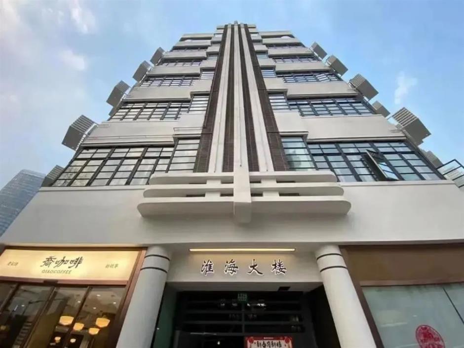 淮海大楼位于淮海中路1312号,原名恩派亚大楼,于1931年动工,1934年初落成,建筑采用钢筋混凝土结构,内设电梯2台。建筑中央原高6层,两翼高4层,后于20世纪80年代改建加层后分别达到7层和5层,外形仍基本保持原风格。1934年建成伊始,淮海大楼就已形成居住功能与商业功能和谐统一的风貌——底层为商铺,二层以上为公寓住宅,建筑内部装潢考究、设备齐全。