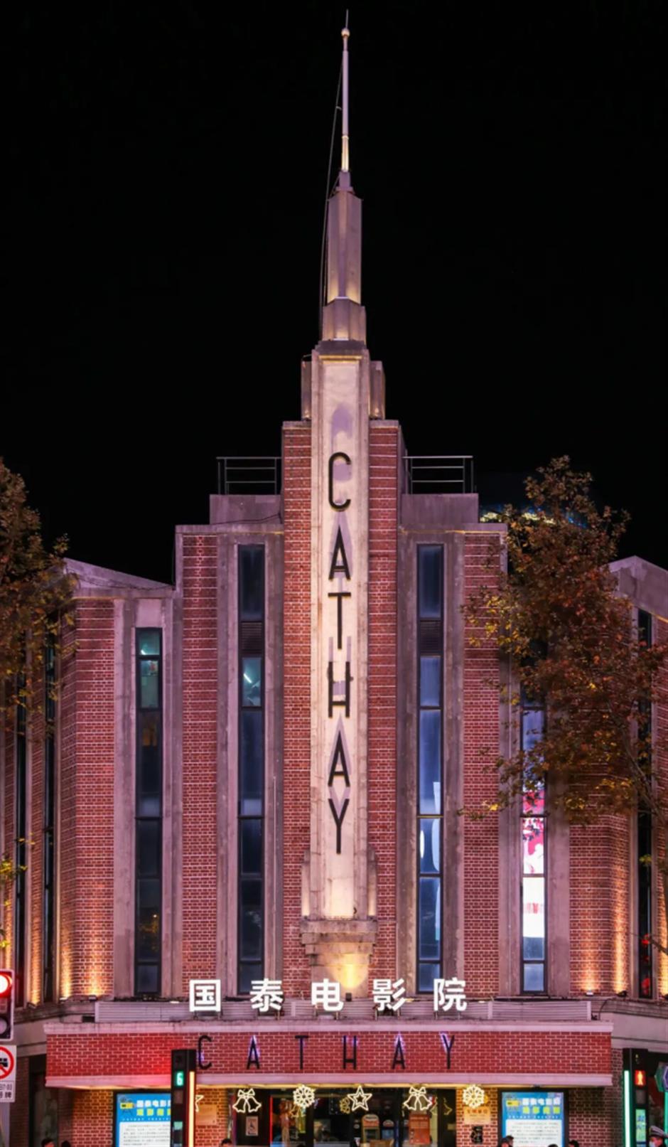 国泰电影院位于淮海中路870号,是一家充满老上海怀旧风情的老牌电影院,建于1930年,钢筋混凝土结构,外墙是竖直线条装饰,绛红色泰山毛面砖外墙加之白色嵌缝给人一种几何直线的秩序感,属典型的装饰艺术派风格。目前,国泰电影院的影院设施正在更新升级,暂停营业。