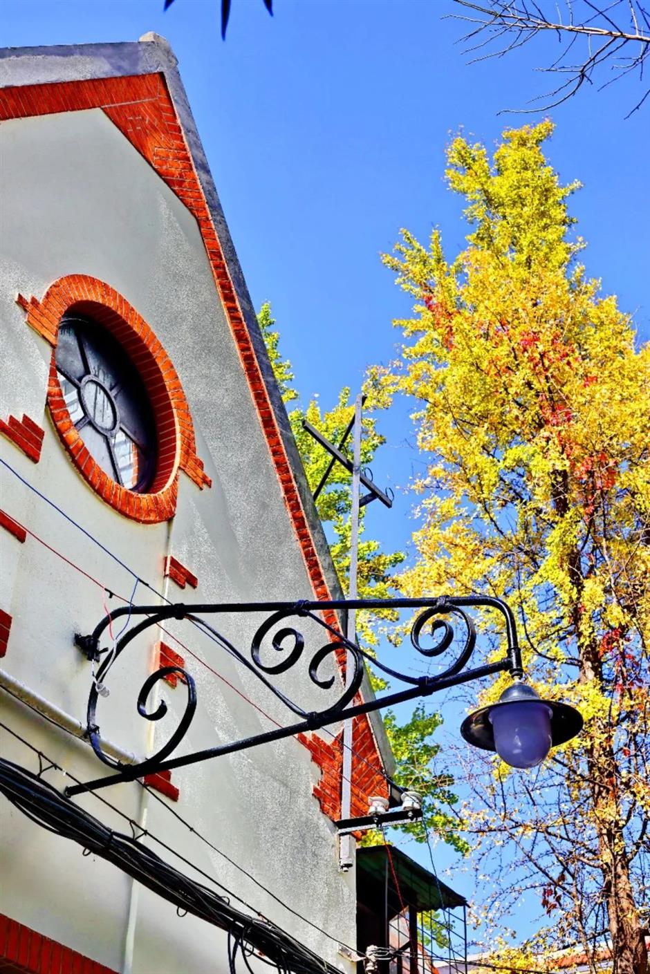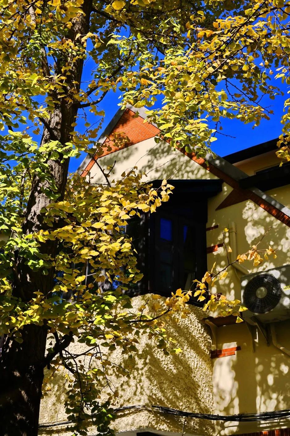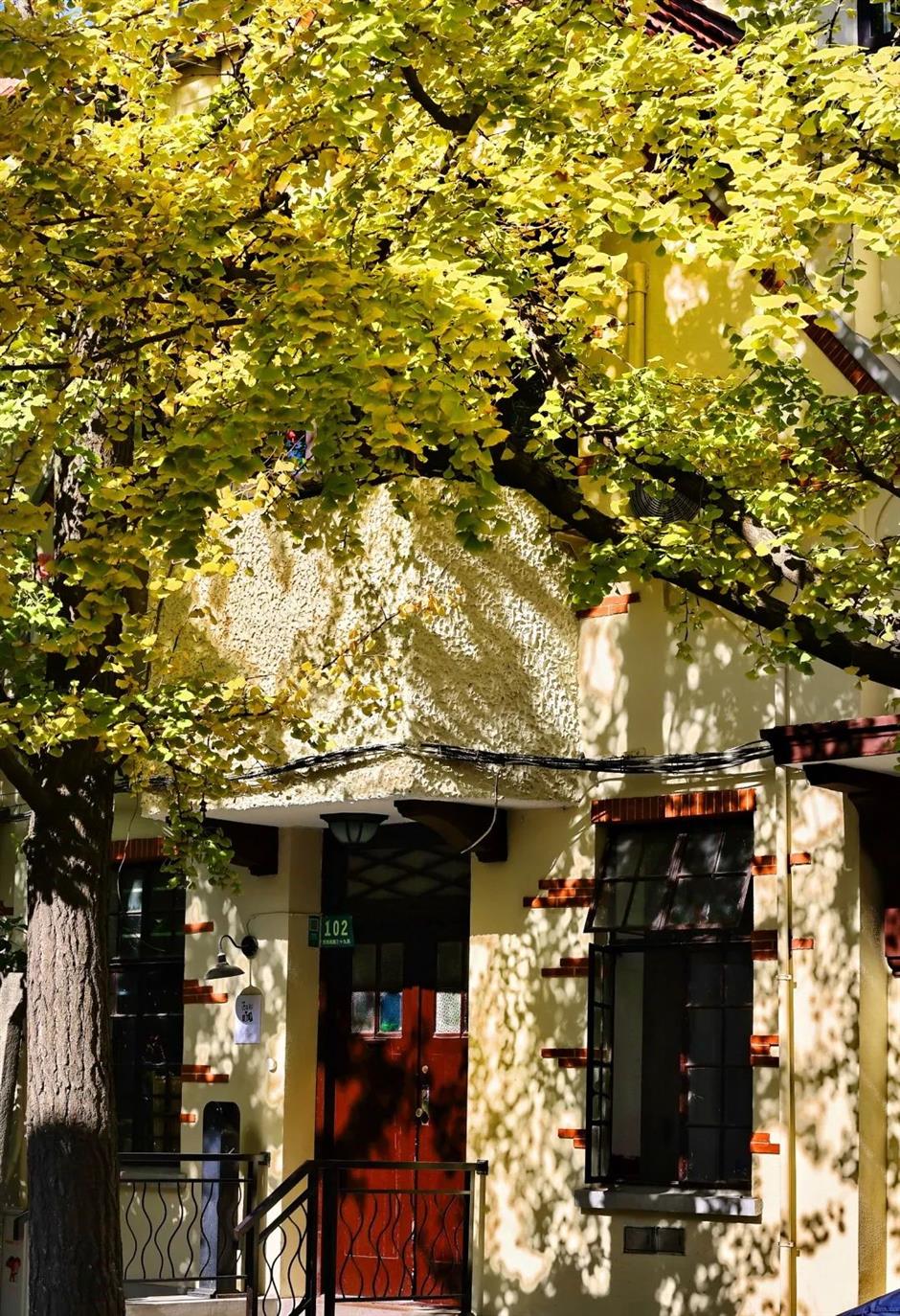 每当深秋初冬时节,弄堂里高大的银杏树,树叶颜色由浅变深,风吹叶落,一片片金黄铺在弄堂里,诗意与烟火相融。