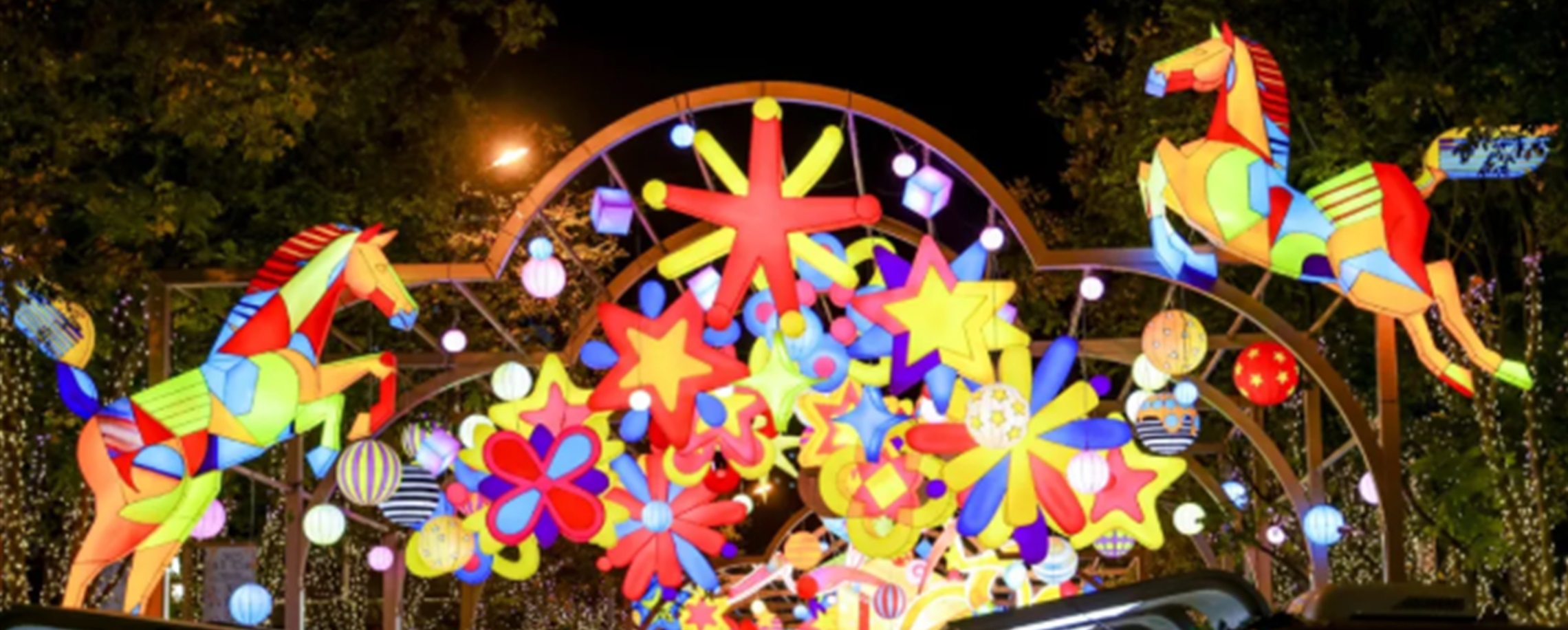 从满载祥瑞的“福禄之门”步入璀璨灯海之中,一幅幅喜庆的楹联承载着满满的年味与祝福,率先映入眼帘,与黄金广场的巨型走马灯相映成趣;走马灯内玲珑剔透的镂空雕花与灯光交融,呈现一派“葫光流转,万象呈祥”的意境。漫步凝晖路,“舞马踏福”灯组凌空飞驰,以三段不同主题诠释三重人生意境。转入中心广场,“骏驰九州,步步生花”的六匹骏马,仿佛踏破时空,昂首飞驰在天地山海之间。一侧的银杏树下“事事如意”灯组蕴藏着“如意繁荣”的美好寓意,为每一位游客送上新春祝福。文昌街,融汇了从敦煌、洛阳博物馆代表性馆藏珍品中提取的元素,带着吉祥如意装点新春。“马跃星河,逐梦苍穹”的场景在九曲桥缓缓展开,湖面化为星海,二十八星宿列布,现实与传说于此交织,形成一场可步入、可触摸的东方生活美学体验。此外,晏海阁“马踏飞花”、五号门“一路繁花”,与旧校场路年味市集相连,游人可边赏灯边挑选新春年货、品尝美食风味、购买上海礼物,在光影交织中沉浸于浓郁的节庆氛围。