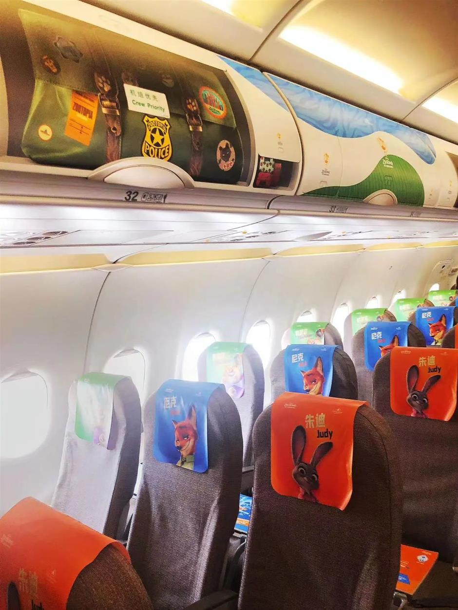 旅客登上“迪士尼•疯狂动物城号”后将会发现遍布机舱内部的主题元素。无论是为不同体型的哺乳动物量身打造的行李架图案,还是印有新园区地图、展现动物居民们最喜爱的城中地标的小桌板,都将让旅客们在飞行途中尽享他们喜爱的《疯狂动物城》角色们的陪伴,并收获灵感,为前往上海迪士尼度假区最新主题园区的奇妙旅程做好准备。