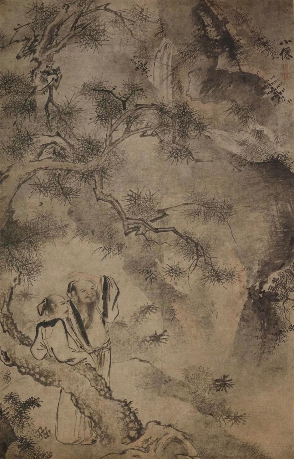 两件题款“小仙”和钤有“吴伟”印的明佚名作品《松下听瀑图轴》和《渔夫问道图轴》,画风显然嗣承明中期江夏派宗师吴伟,衹是笔致更为峭利和迅疾,细查画法,与传世浙派后学吴思恩的风格为相类。上博专家认为,此两图很可能出于吴思恩之手,虽非吴伟手迹,却是不可多得的江夏派后学之作。
