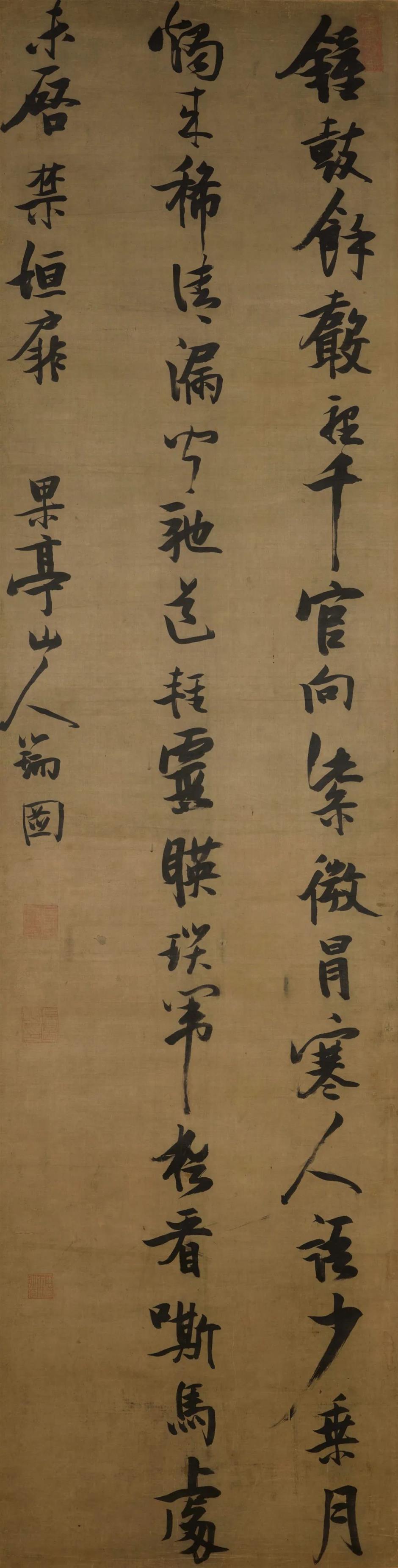 张瑞图(1570-1641),字长公,号二水、果亭山人等,福建晋江人,官至礼部尚书,能画,书法与董其昌、邢侗、米万锺同列“晚明四大家”。此作书唐人诗,用笔方斫,取势峻峭,风格奇逸。