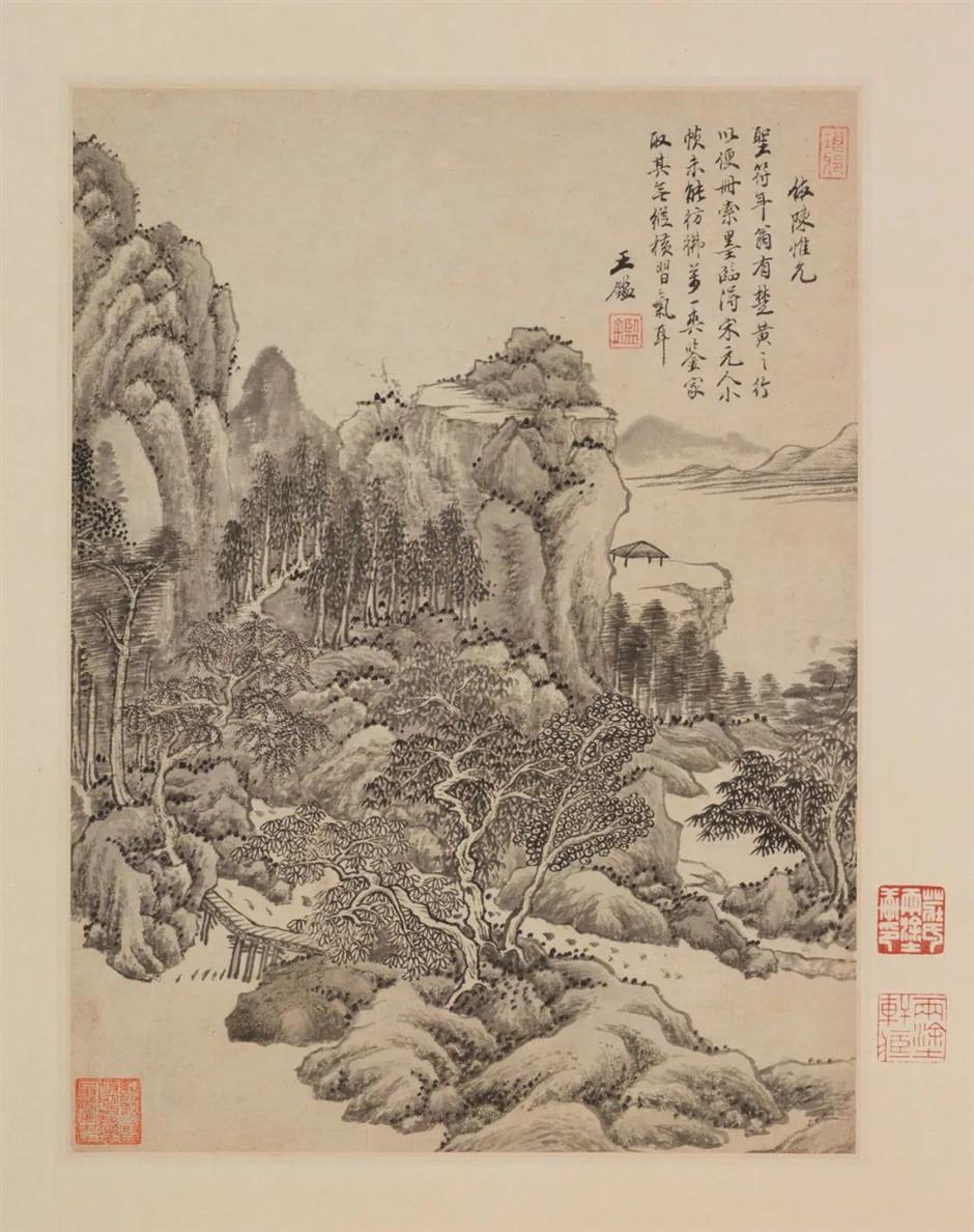 王鑑(1598-1677),字玄照、圆照,号染香庵主,江苏太仓人,善山水,格古功深,与王时敏、王翚、王原祁合称“四王”。此图仿元末文人画家陈惟允,墨色清厚而用笔绵密,得王蒙之气。