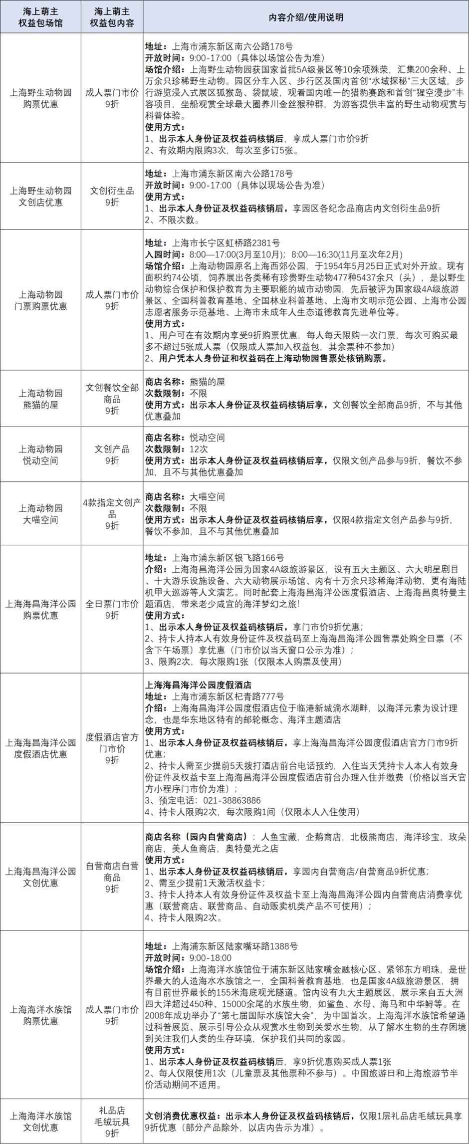 购买即可享受四大热门场馆专属福利,与萌宠近距离互动。上海野生动物园:打卡人气动物明星,解锁趣味投喂体验;上海动物园:漫步动物家园,邂逅超多治愈萌物;上海海昌海洋公园:赴深海之旅;看虎鲸巨浪、与海豚共舞;上海海洋水族馆:探索海底秘境,邂逅多样水生生物。