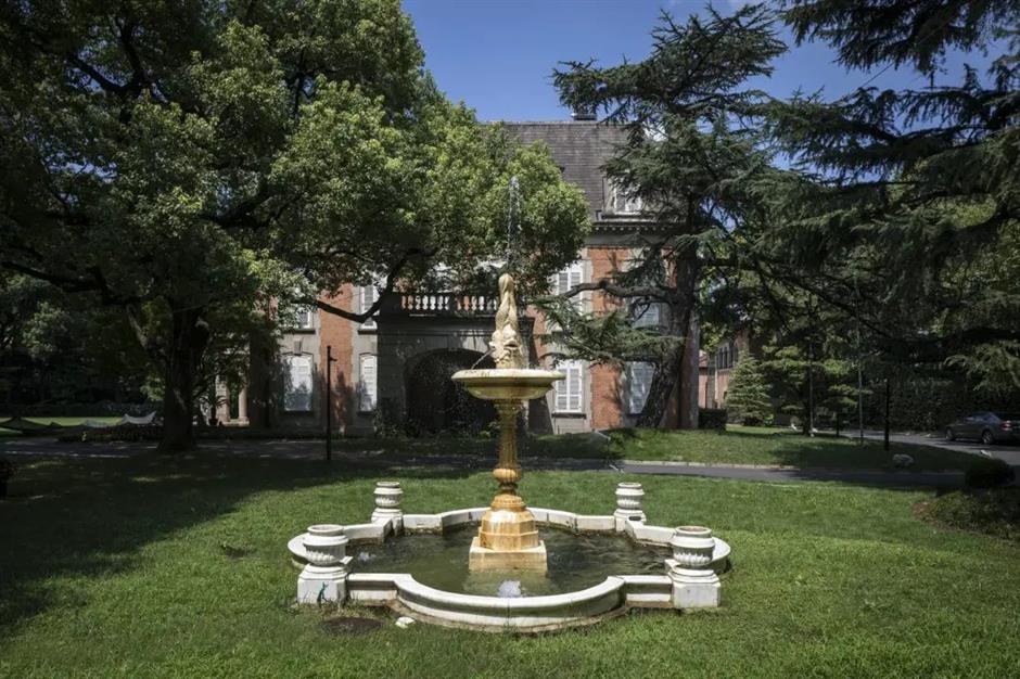 建筑朝南的主立面面向大片修建得异常整齐的绿色大草坪。大草坪上栽种着参天雪松,四处点缀着无名野花。法式园林中常见的喷泉和六角亭也能在草坪上轻松找到。
