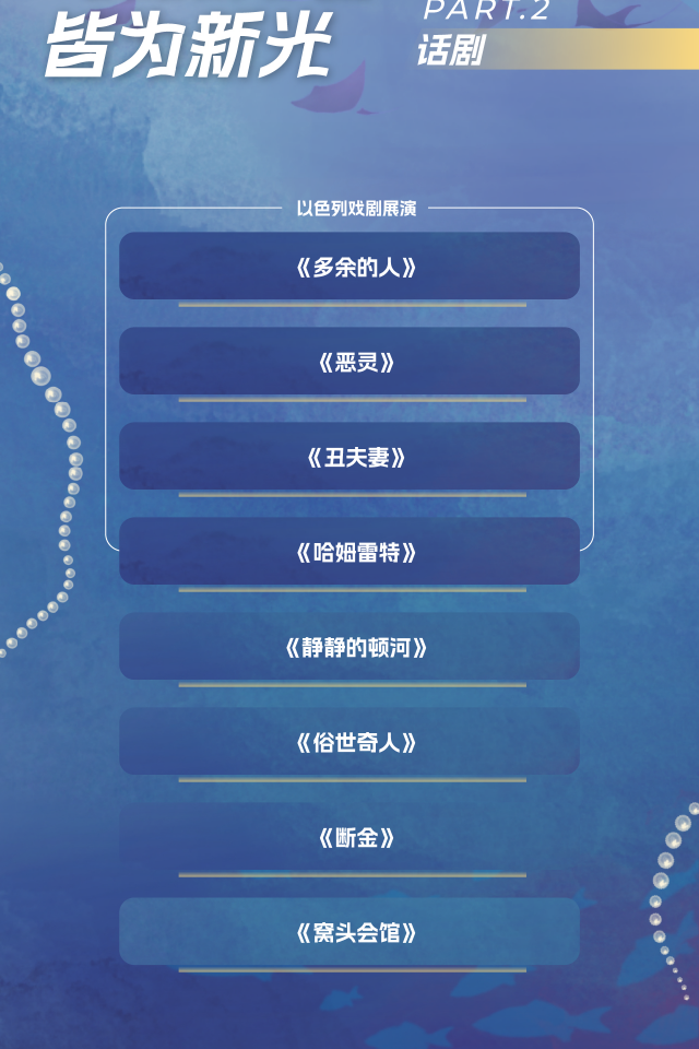 话剧板块,文化广场将首度为沪上观众带来以色列戏剧展演单元,呈现以色列原版话剧《多余的人》《恶灵》《丑夫妻》《哈姆雷特》。此外,俄罗斯原版话剧《静静的顿河》,以及《俗世奇人》《断金》《窝头会馆》等多部文学经典改编作品将再次登临文化广场。