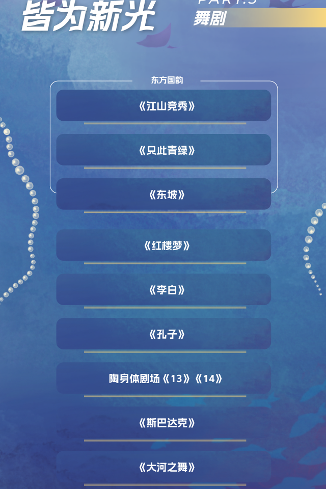 舞剧板块,舞蹈诗剧《只此青绿》《东坡》、音乐诗画《江山竞秀》等“东方国韵”系列演出,将大宋美学与传统韵味再次带至剧场空间。同时,舞剧《红楼梦》《李白》《孔子》、陶身体剧场“数位系列”作品《13》《14》,以及辽宁芭蕾舞团芭蕾舞剧《斯巴达克》、爱尔兰踢踏舞秀《大河之舞》也将陆续登上文化广场的舞台。