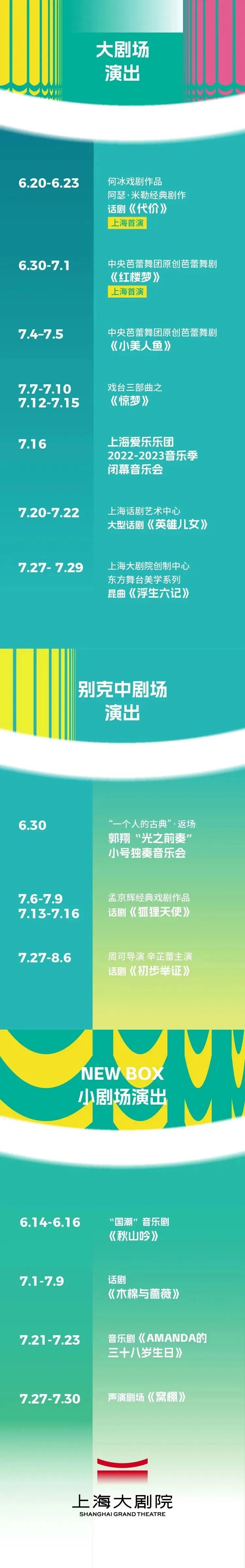 上海话剧艺术中心出品、改编自巴金小说《团圆》和长春电影制片厂拍摄同名电影的话剧《英雄儿女》再唱英雄赞歌,苏西·米勒原作、伦敦西区话剧《初步举证》中文版全新制作由周可执导、实力派演员辛芷蕾上演独角戏,导演陈佩斯与编剧毓钺再度合作的口碑话剧《惊梦》三度来沪回归,上海大剧院创制中心制作的“东方舞台美学系列”昆曲《浮生六记》原班人马再度上演。