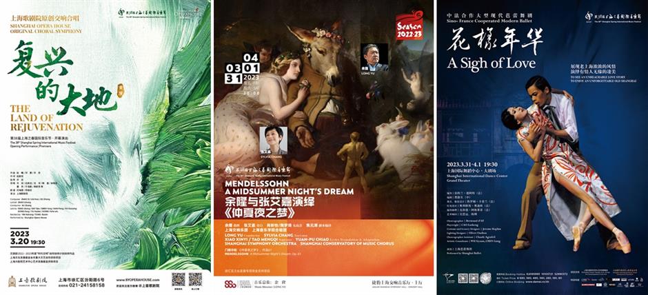 From left: posters for the opening concert "The Land Of Rejuvenation," Shanghai Symphony Orchestra's "A Midsummer Night's Dream," and modern ballet "A Sigh of Love."