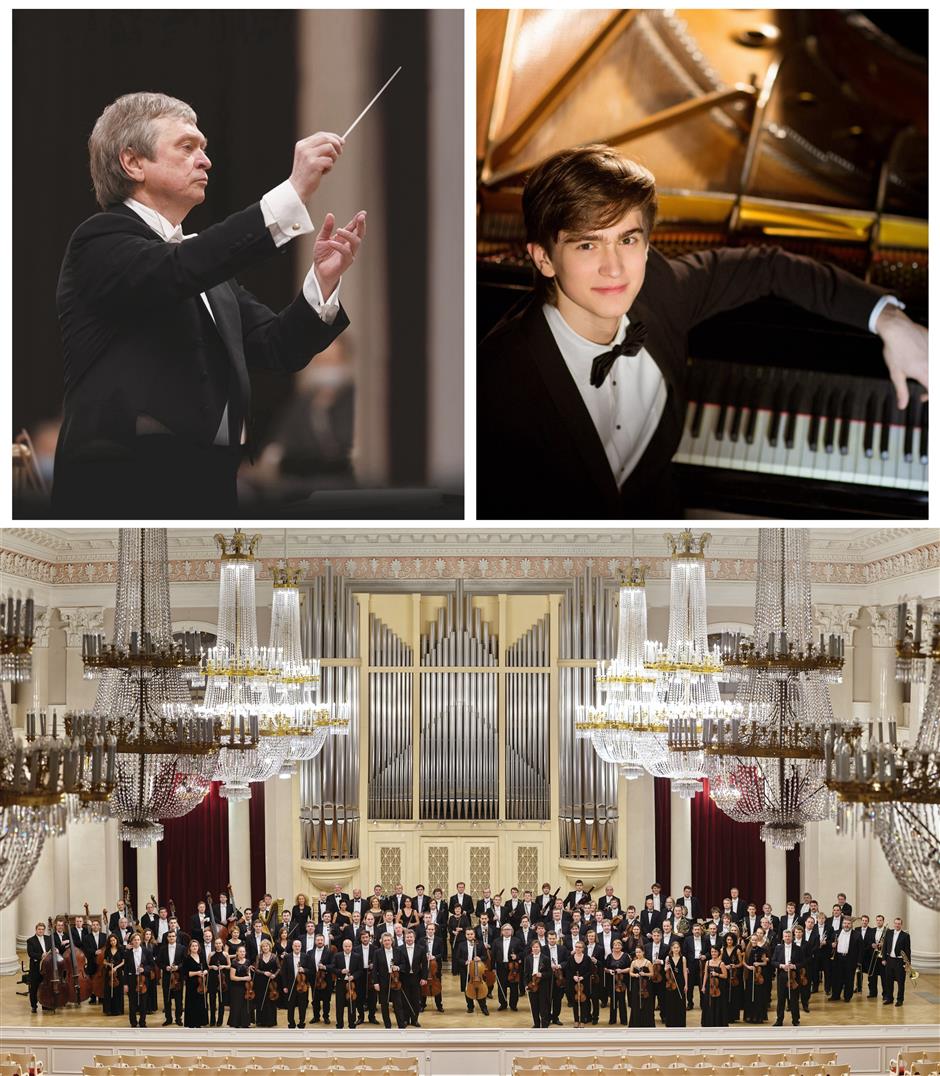 The St Petersburg Philharmonic Orchestra will perform on June 25 under the baton of Nikolay Alexeev (top left). Young pianist Daniel Kharitonov (top right) will join the performance.