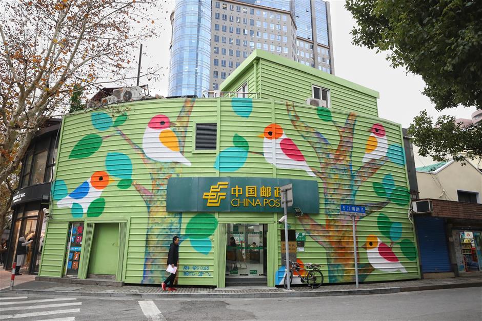 At the end of the road near Huangpi Road S., a colorful picture of two trees and five birds has been painted on the post office, recalling its history as one of the city’s most popular street markets.