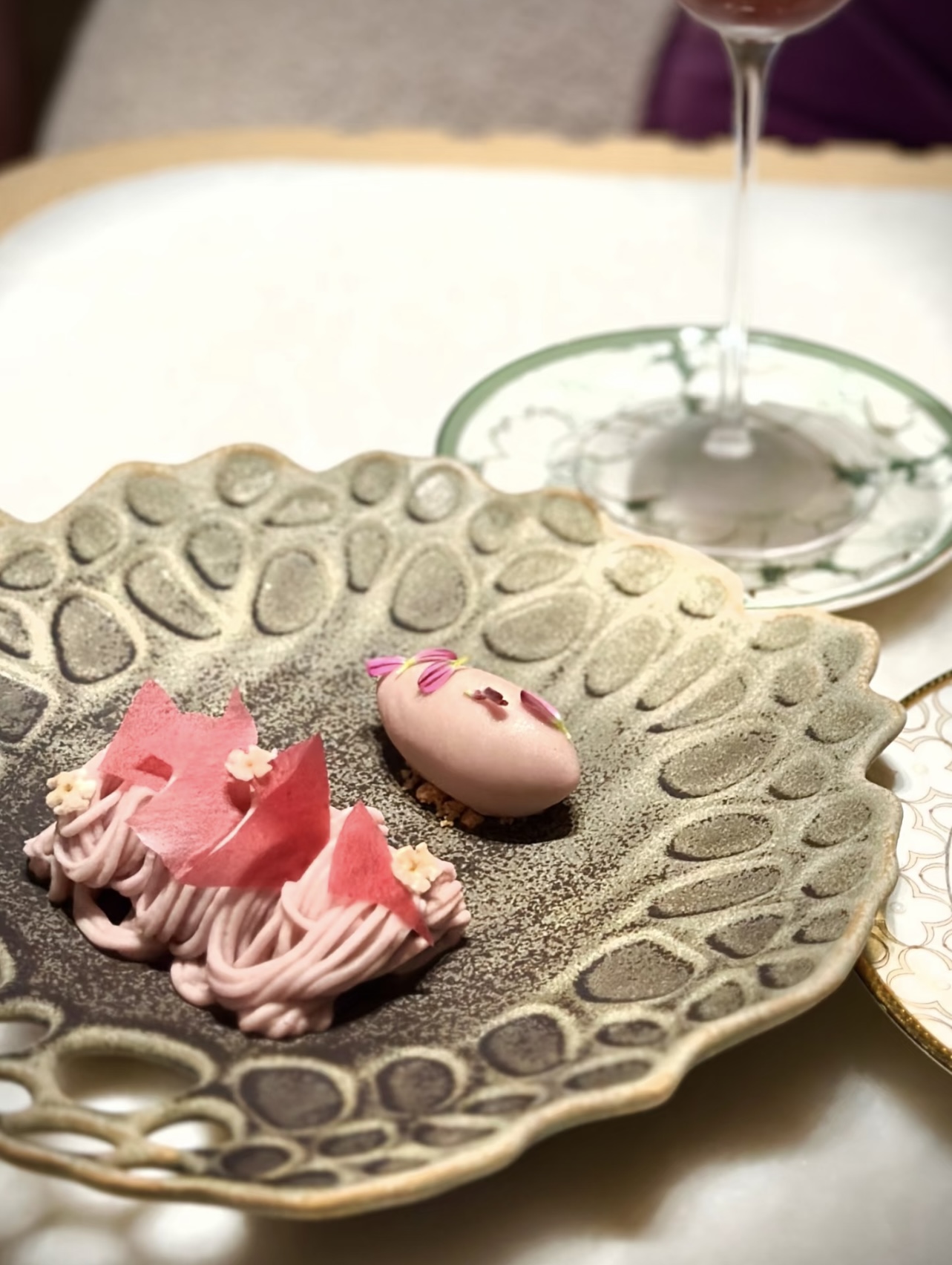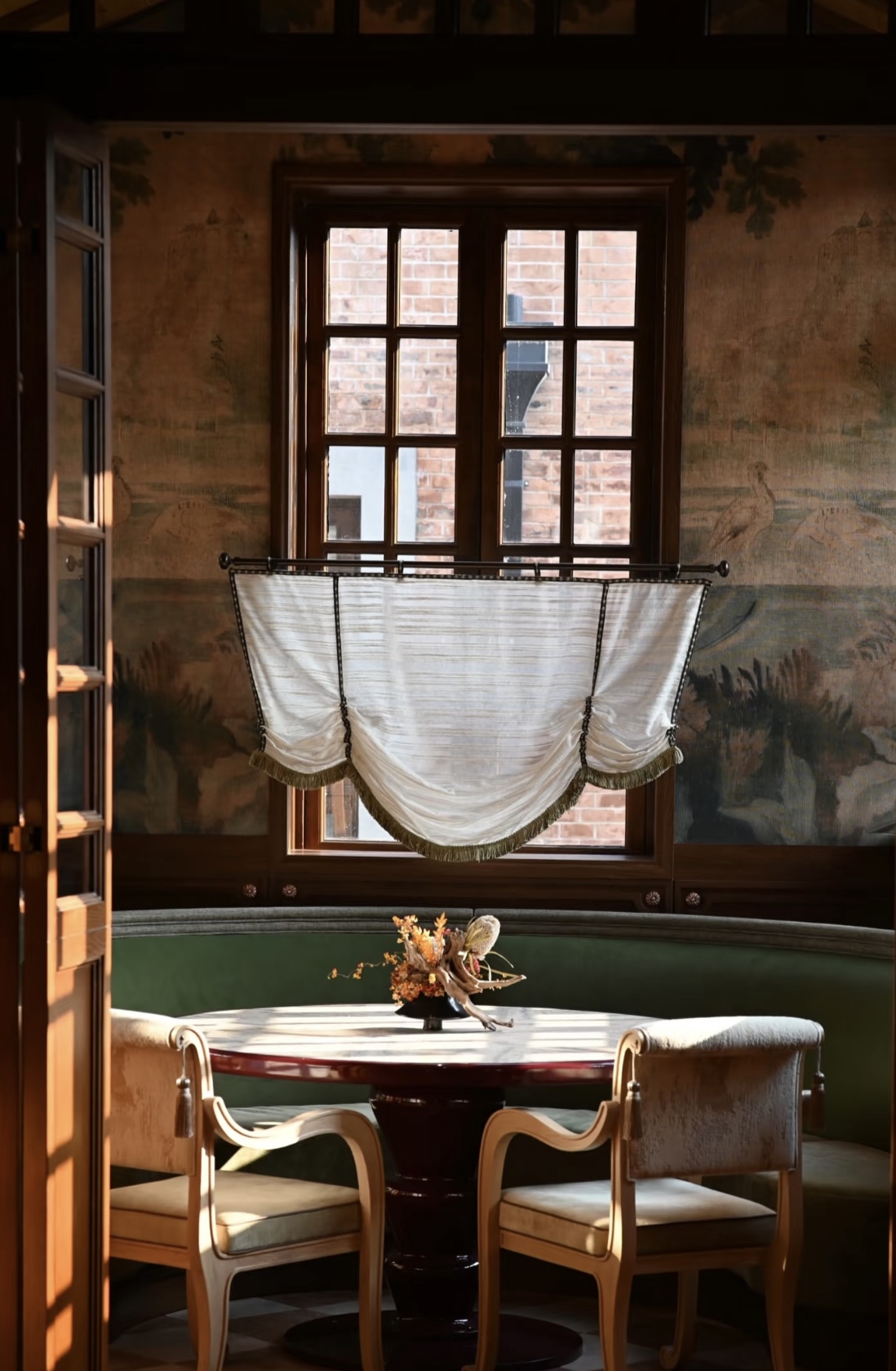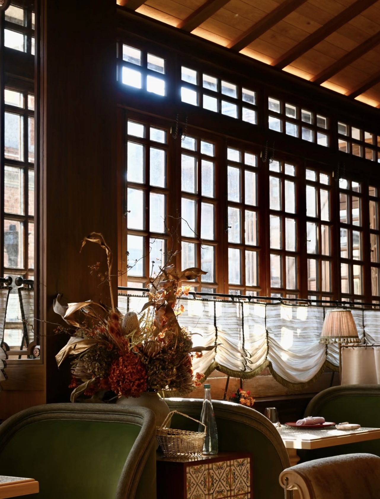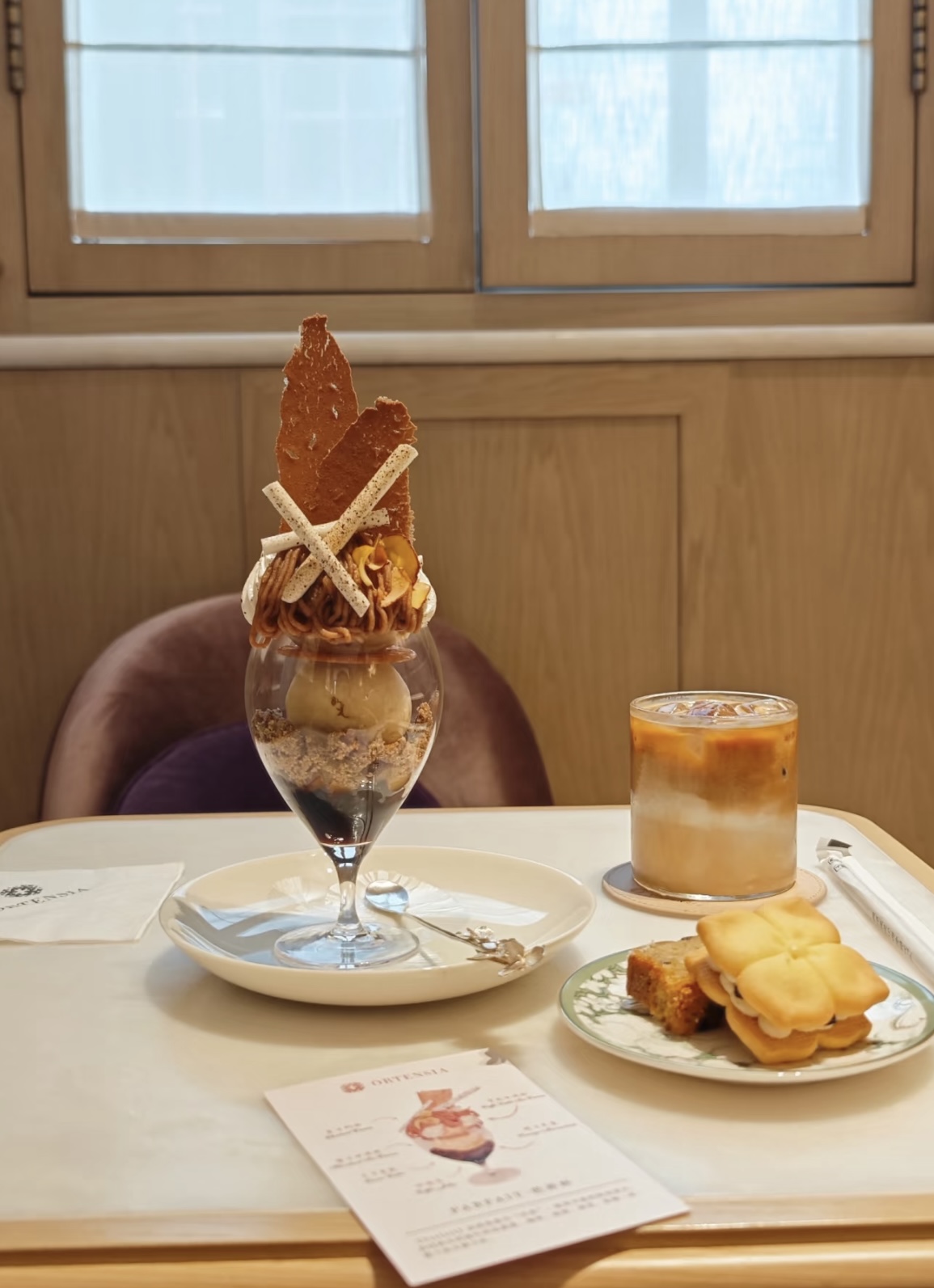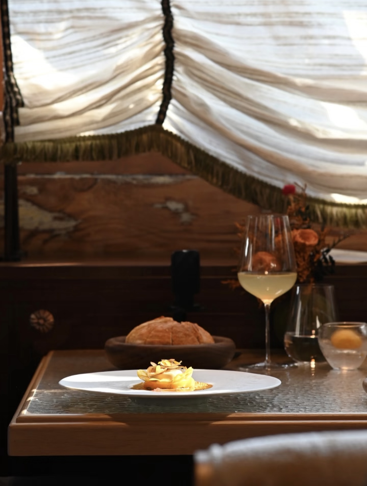 레스토랑은 2층에 위치하며, 1층에는 브랜드의 카페와 디저트 공간이 있습니다. 우아하고 프렌치 빈티지 스타일의 카페는 풍부한 벨벳 질감과 세련된 분위기를 자랑합니다. 낮 시간에 운영되며 사전 예약이 필요합니다.