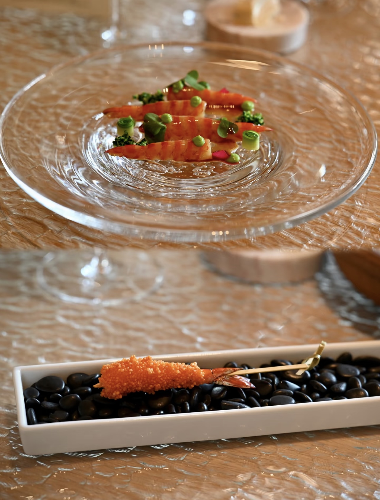 수국 모티프는 레스토랑 곳곳에 녹아 있습니다. 꽃에서 영감을 받은 대형 플로랄 설치물이 식사 공간 중앙에 시각적 중심점으로 자리잡고 있으며, 문 장식, 장식 요소, 심지어 식기류에도 같은 테마가 반영되어 있습니다.