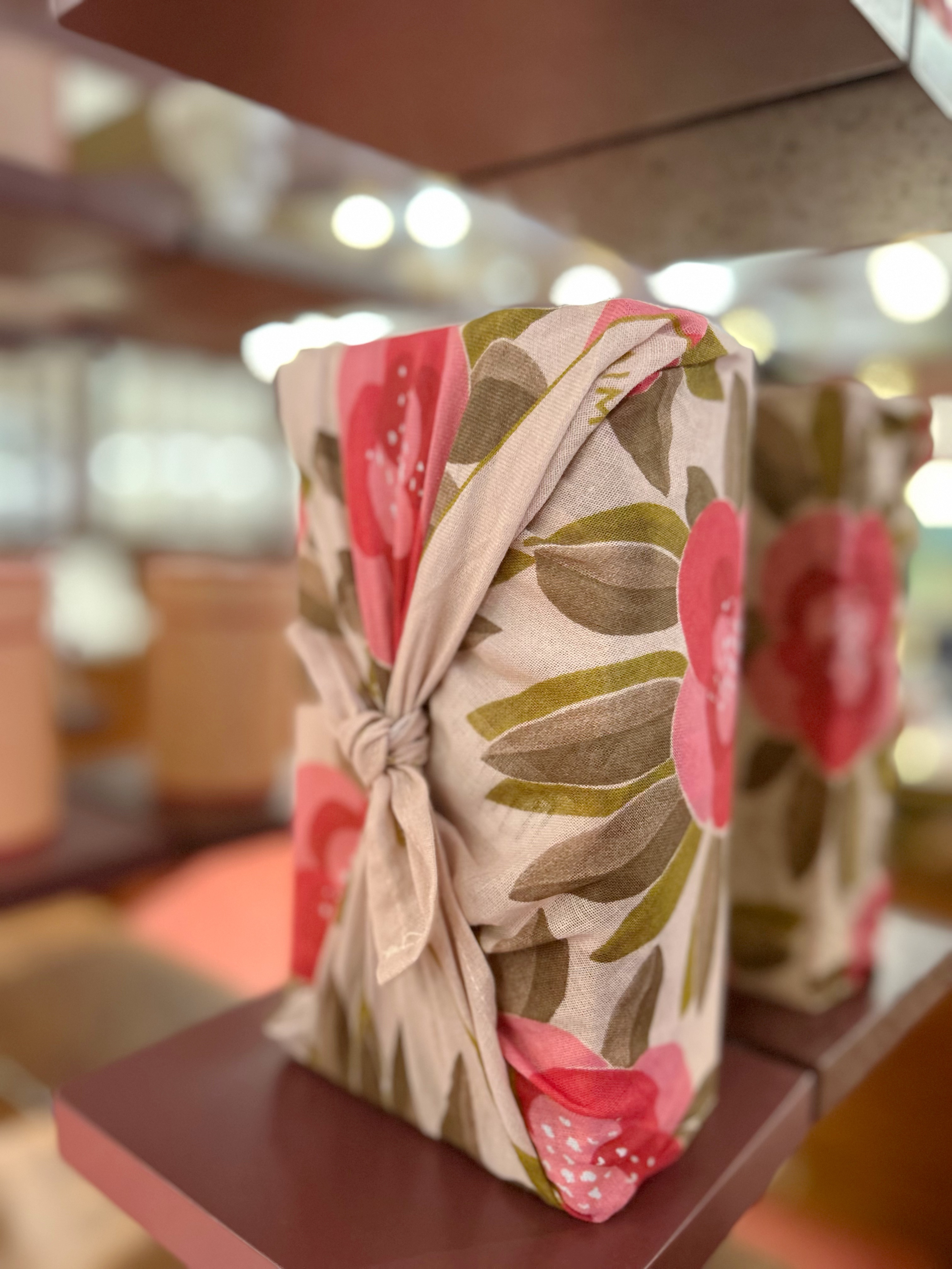 구매한 물품은 수취인의 이니셜이 인쇄된 분홍색 포장지로 정성스럽게 포장됩니다.