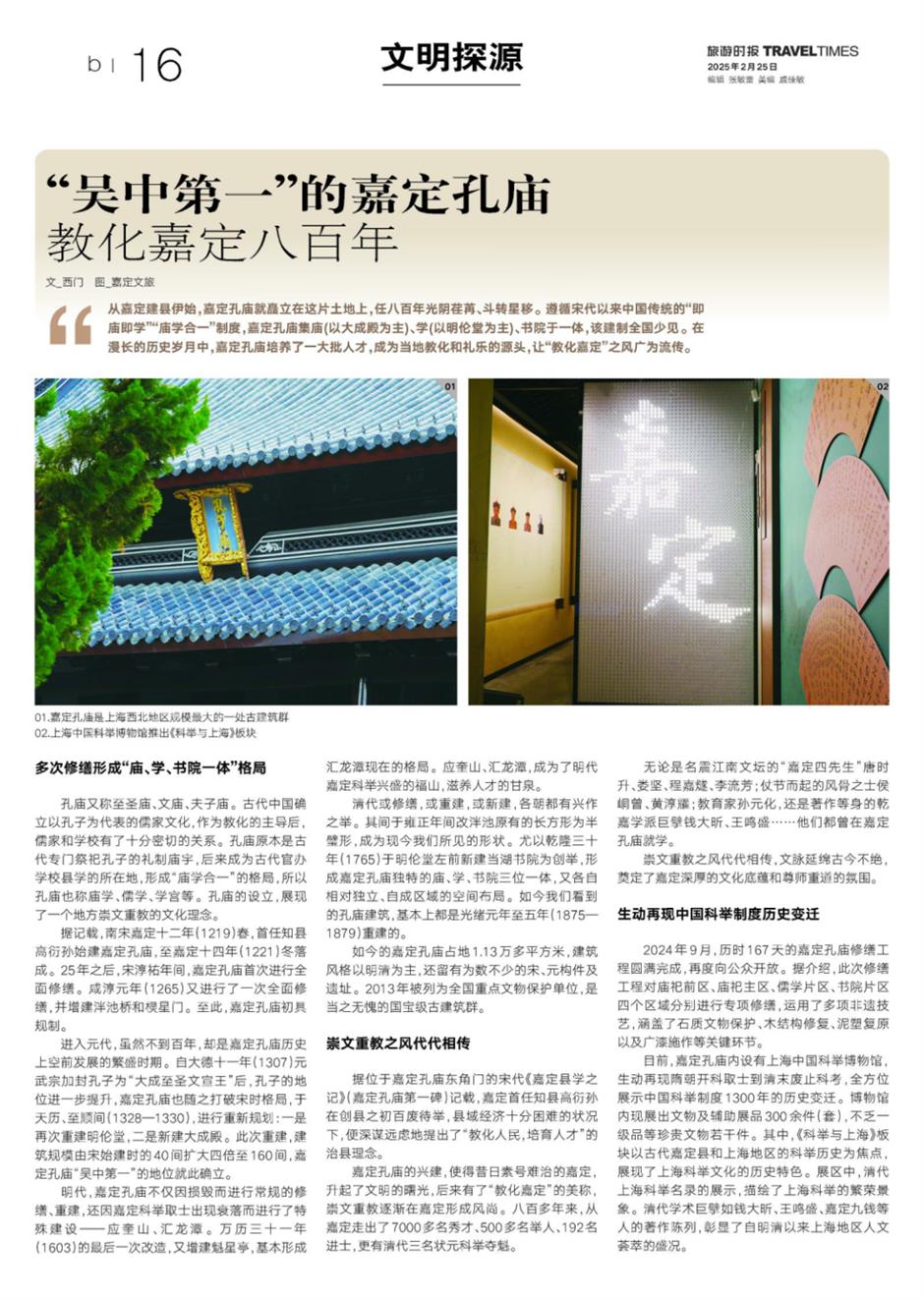2024年9月,歷時167天的嘉定孔廟修繕工程圓滿完成,再度向公眾開放。據介紹,此次修繕工程對廟祀前區、廟祀主區、儒學片區、書院片區四個區域分別進行專項修繕,運用了多項非遺技藝,涵蓋了石質文物保護、木結構修復、泥塑復原以及廣漆施作等關鍵環節。