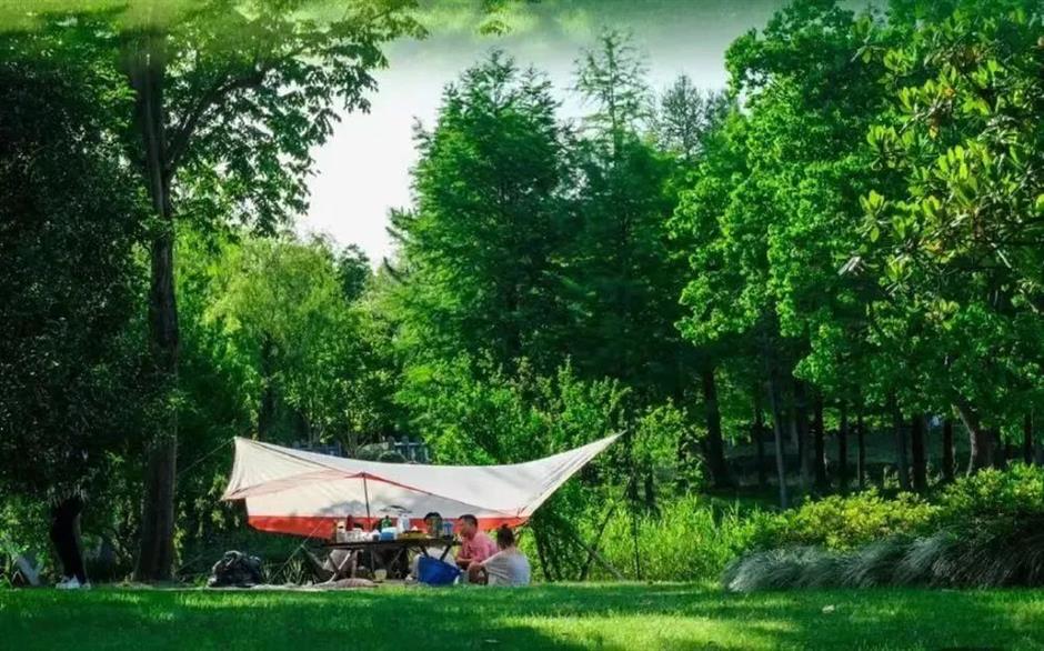 最近,位於吳涇鎮的浦江第一灣公園,露營的帳篷也是一頂連一頂。公園裡可以看到黃浦江,露營的草坪邊上也有溪流靜靜流淌。這裡自然景觀獨特,森林周邊有大片的草地可以放放風箏,遛遛娃。尋找一塊空地,在大樹樹蔭下搭起帳篷,吹著江風就可以過一個愜意的假期,是享受田園生活的好去處。