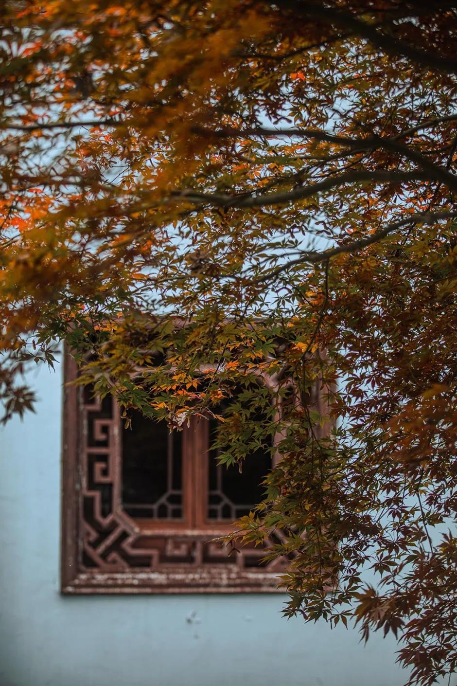 待到深秋,秋風吹落片片火紅楓葉,飄在園林建築的白牆黛瓦之間,譜寫出一曲美妙的秋日情歌,更加讓人流連.