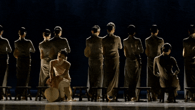 下半場是《春之祭共舞》,以古代祭祀禮儀為原型,以斯特拉文斯基的《春之祭》這一西方樂章為配樂。作品中,舞者們以太極、推手、散打中的東方意蘊來表現「武舞同源」。